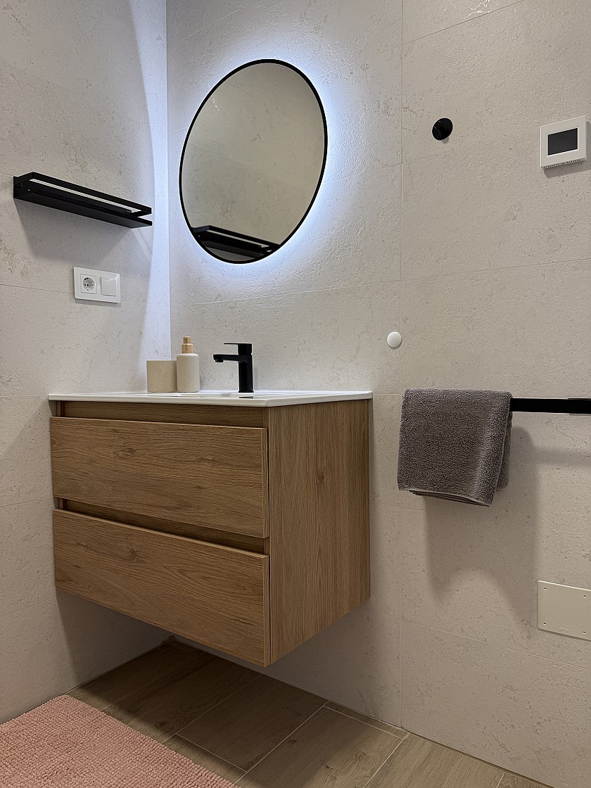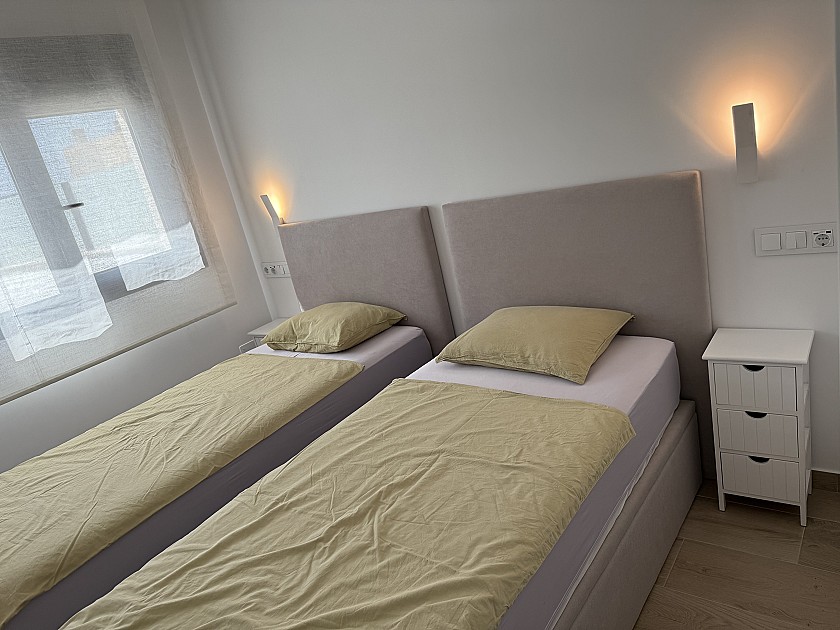 Das Apartment verfügt über 2 Schlafzimmer (1 Doppelbett und 2 Einzelbetten) und 2 moderne Bäder, beide ausgestattet mit großzügiger Regendusche, Handbrause, Waschbecken und WC.