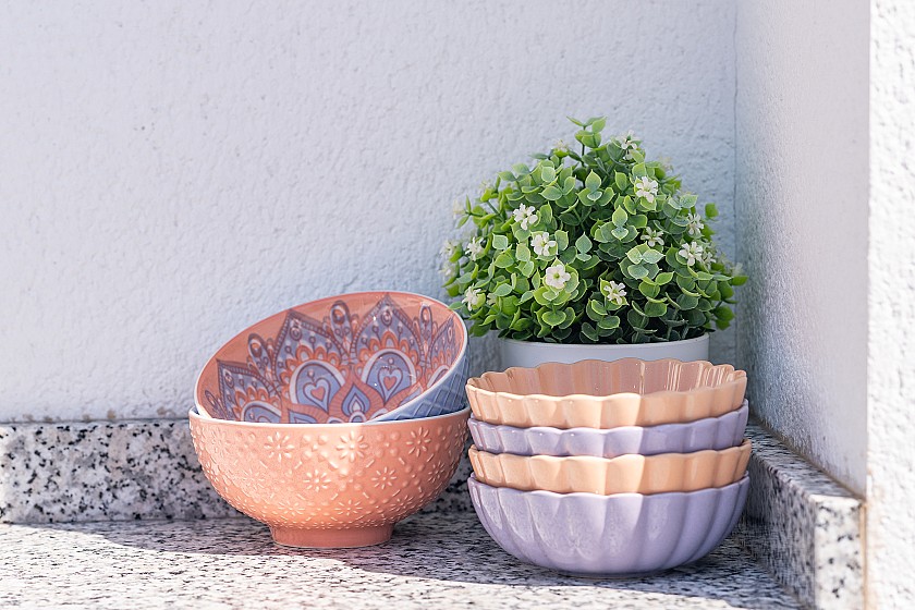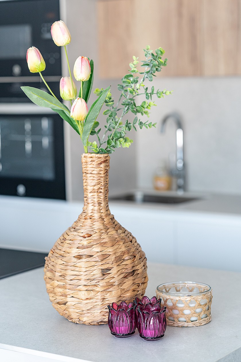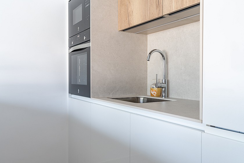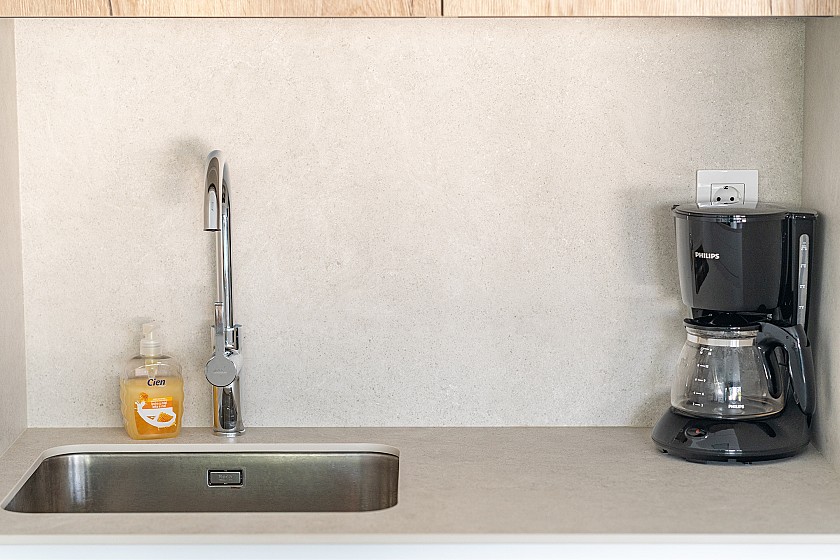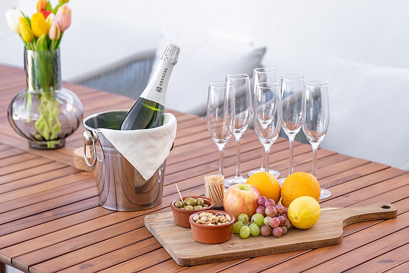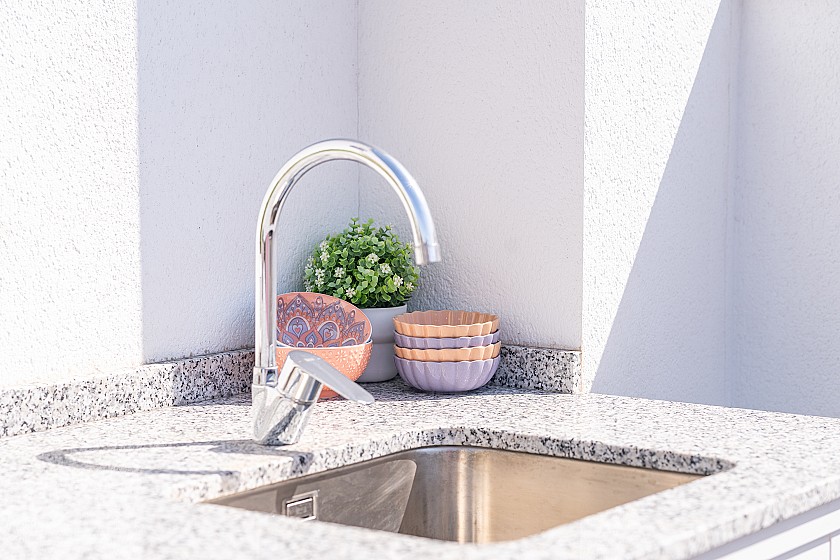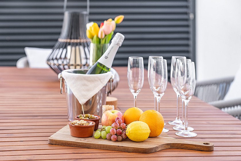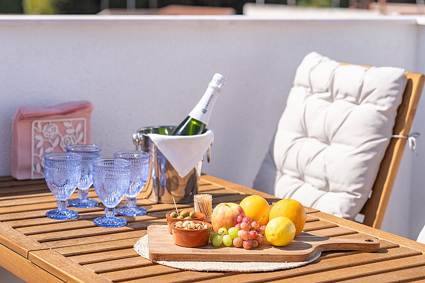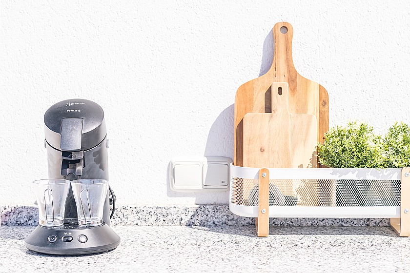 A staircase leads to the generous rooftop terrace with outdoor furniture, dining table and an outdoor kitchen equipped with tableware, Senseo coffee machine, microwave and fridge. The perfect spot for a peaceful morning coffee, a sunny afternoon or a warm summer night under the stars.