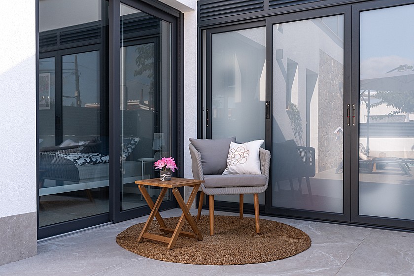 The home is cleverly laid out and wonderfully bright. The cosy living room features large windows and direct access to the terrace with private pool and patio — perfect for lounging, sunbathing or dining outdoors.