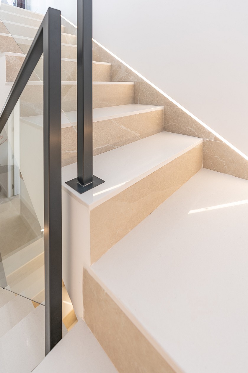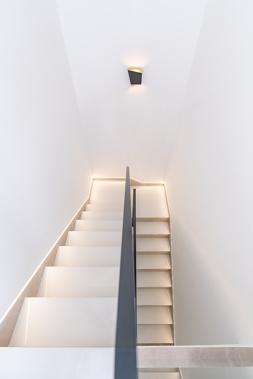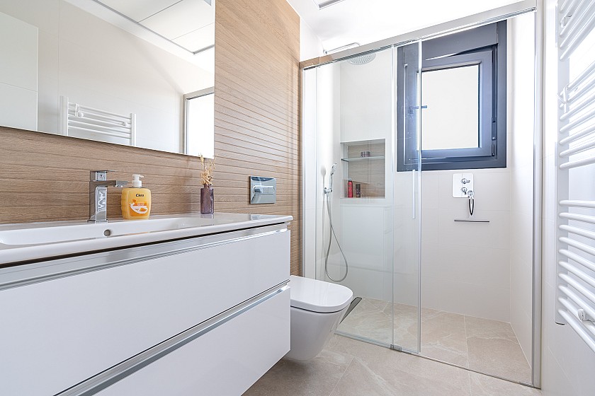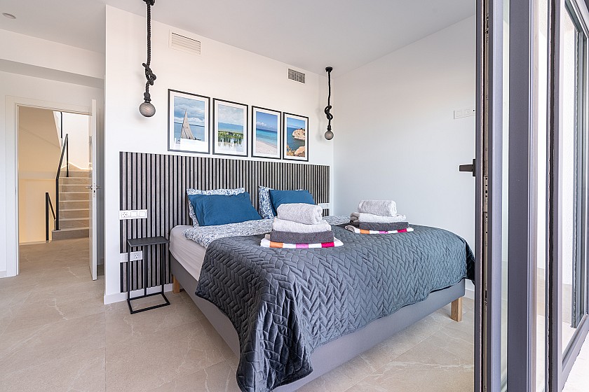 The upper floor offers two comfortable bedrooms, each with its own private balcony. The second bathroom is stylishly finished with a walk-in shower, toilet and ambient LED lighting.