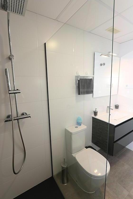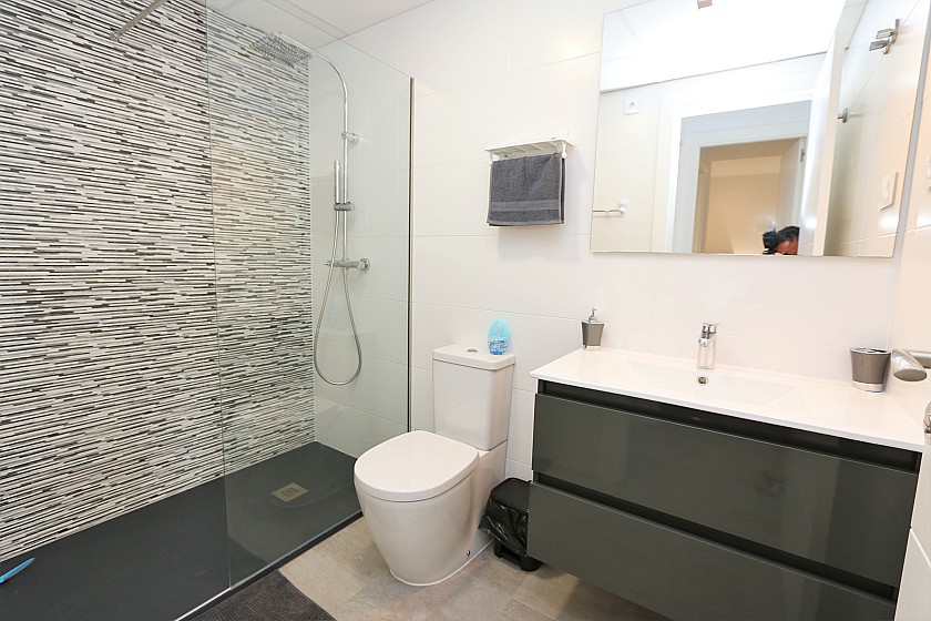 There are two comfortable bedrooms with double beds (160 x 200) and ample storage. Two modern bathrooms with walk-in showers, one of which is en-suite, complete the setup.