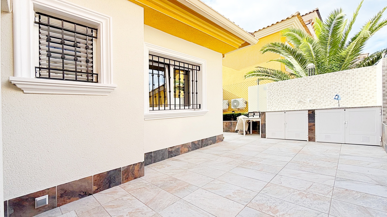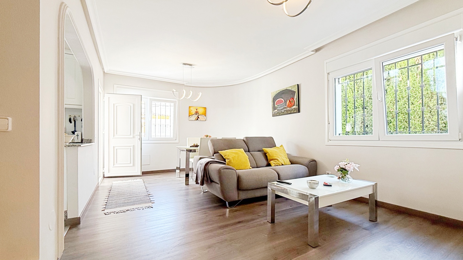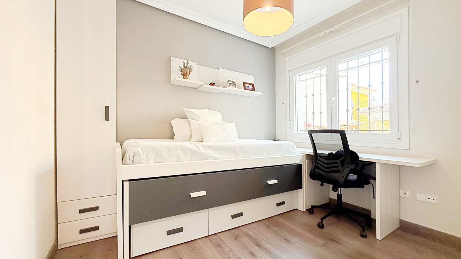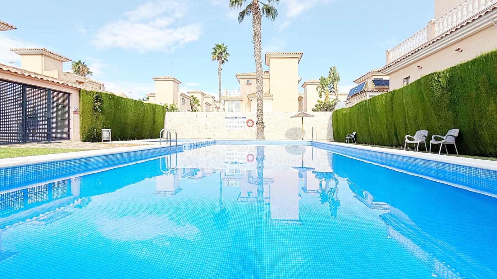 Esta magnífica villa independiente de 105 m², completamente reformada y distribuida en dos plantas, se encuentra en una urbanización privada con piscina comunitaria, a poca distancia de la playa.La planta baja ofrece un amplio y luminoso salón-comedor con cocina abierta, creando un ambiente moderno y funcional, ideal para disfrutar en familia o con amigos. En este mismo nivel se sitúan dos dormitorios de buen tamaño y un baño completo renovado, aportando practicidad y confort en el día a día.La primera planta está destinada al dormitorio principal, un espacio amplio y luminoso con baño en suite, que garantiza privacidad, independencia y comodidad.El interior de la vivienda ha sido renovado con materiales de alta calidad: suelos de tarima, ventanas Climalit con doble acristalamiento y sistema oscilobatiente, lo que asegura un excelente aislamiento térmico y acústico, además de aportar un estilo actual y acogedor a cada estancia.En el exterior, la propiedad dispone de aparcamiento privado y trastero, proporcionando comodidad y espacio extra de almacenamiento. La urbanización cerrada cuenta con zonas comunes y piscina comunitaria, ideales para disfrutar del clima mediterráneo durante los meses más cálidos.Su ubicación es otro de sus grandes atractivos: muy cerca de la playa y rodeada de todos los servicios esenciales, combina tranquilidad residencial con la comodidad de tener todo al alcance de la mano.Una vivienda lista para entrar a vivir, perfecta tanto como residencia habitual como como segunda vivienda vacacional.