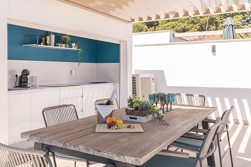 Het absolute hoogtepunt is het royale privé dakterras van circa 85 m. Kook buiten in de superluxe keuken en geniet van lange avonden aan de grote eettafel. Het loungegedeelte nodigt uit tot genieten van eindeloze zonsondergangen met familie en vrienden.